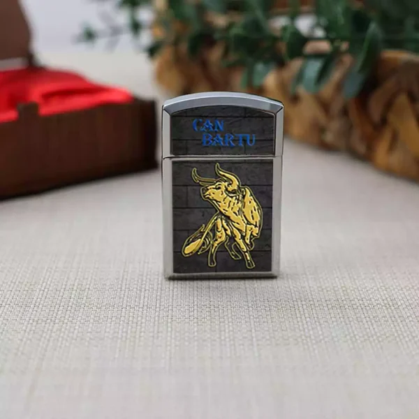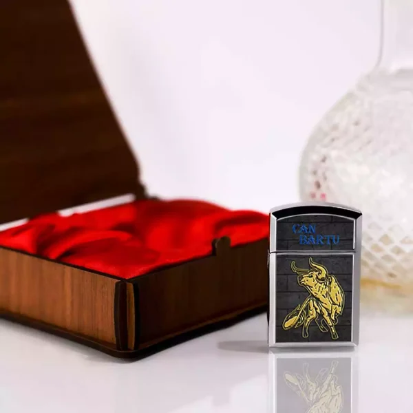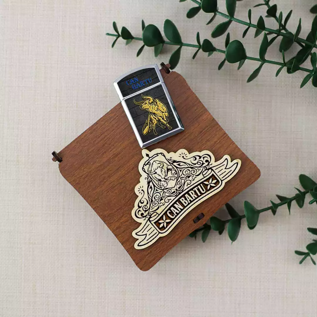 Ahşap Kutulu Boğa Armalı İsme Özel Baskılı Çakmak
