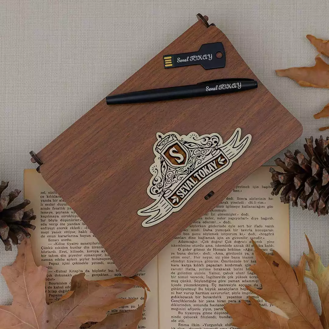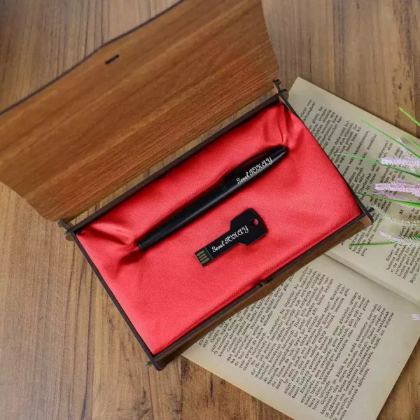 Ahşap Kutulu İsme Özel Siyah USB Bellek Kalem Seti
