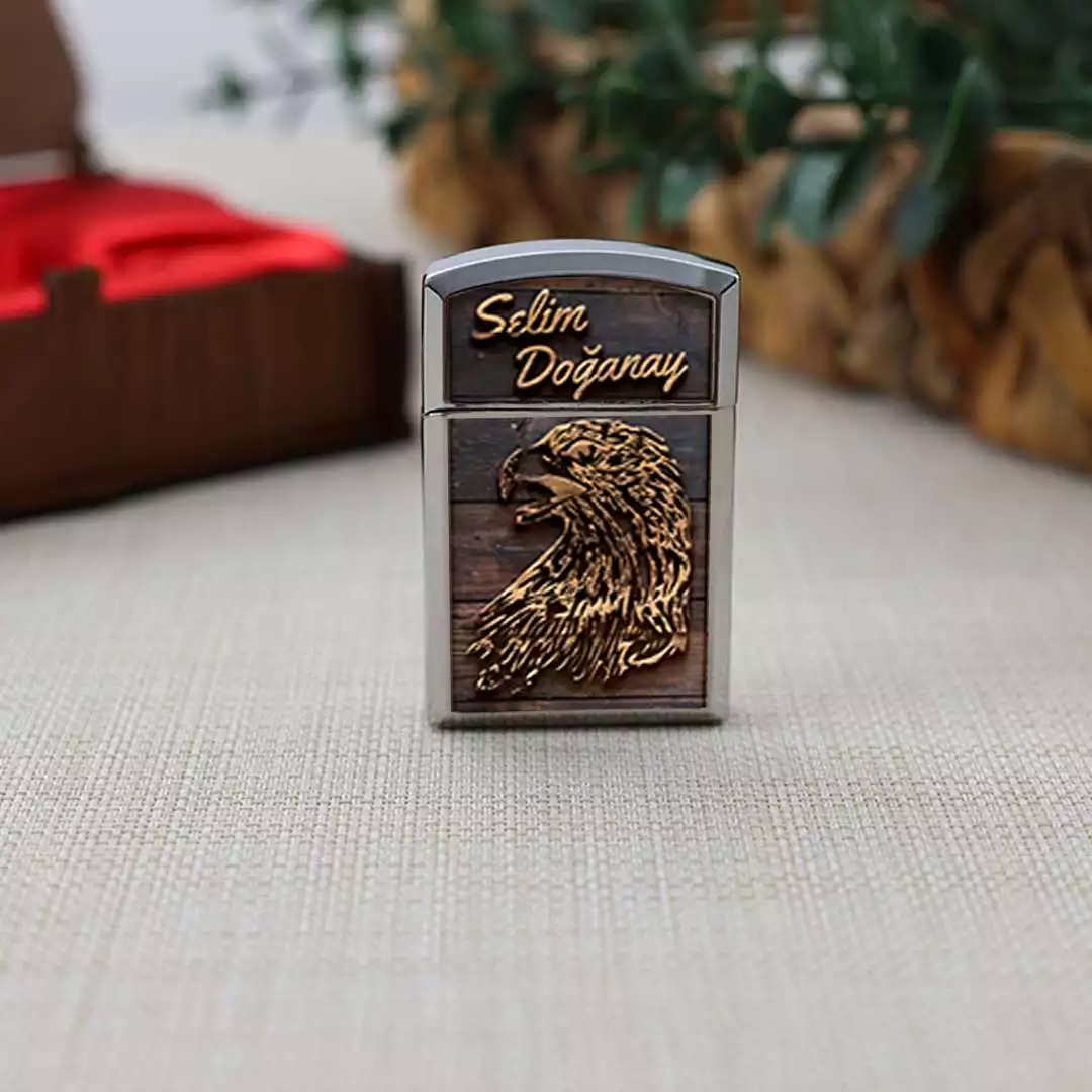 Ahşap Kutulu Kara Kartal Desenli Retro Ahşap Tasarımlı Kişiye Özel Baskılı Çakmak