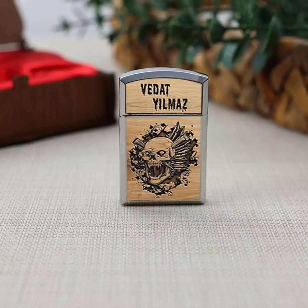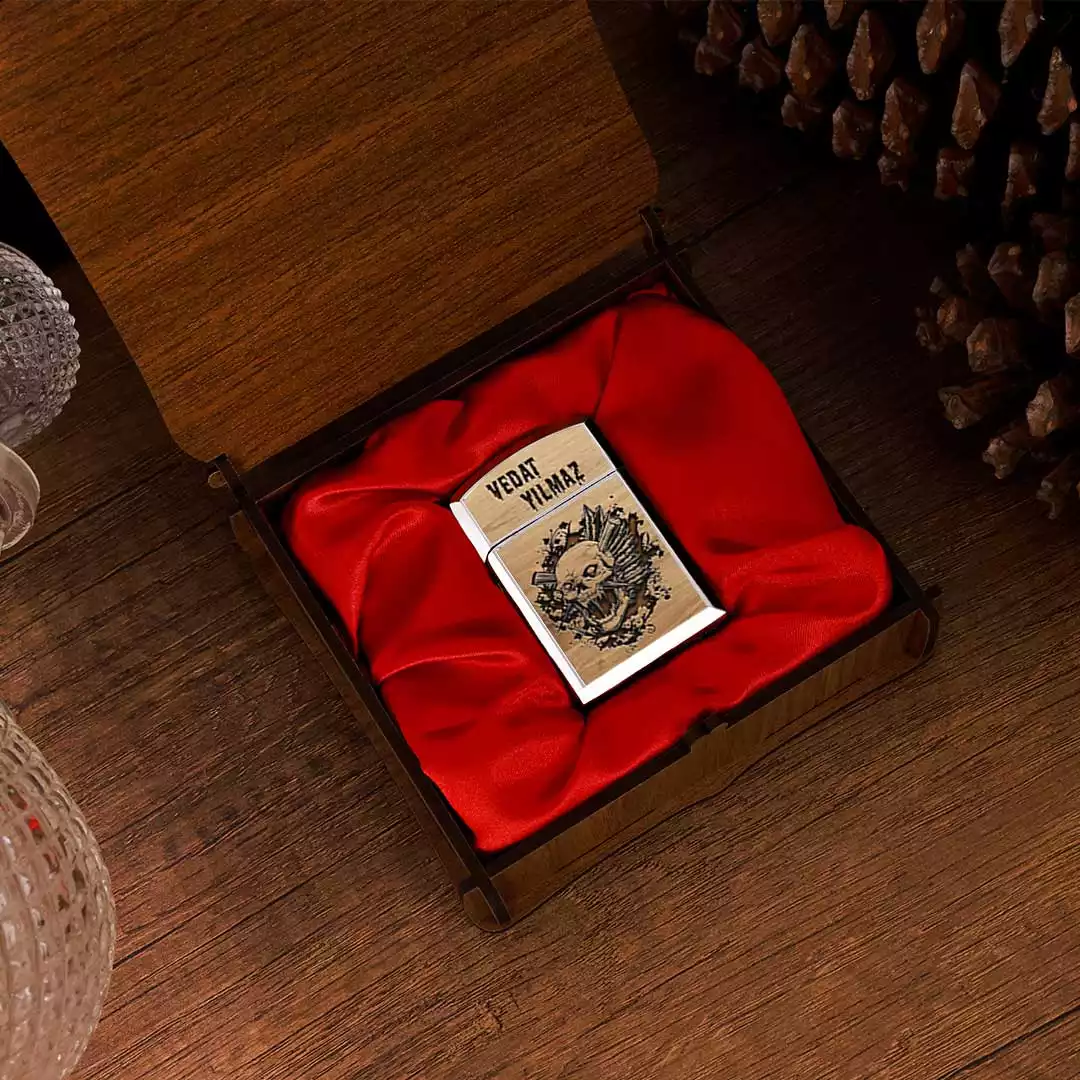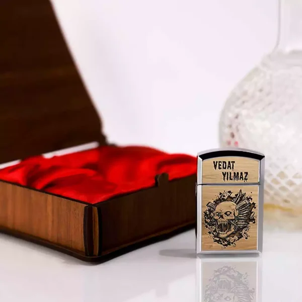 Ahşap Kutulu Kuru Kafa Armalı Ahşap Tasarımlı Kişiye Özel Baskılı Çakmak