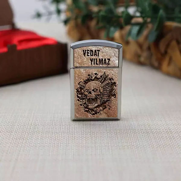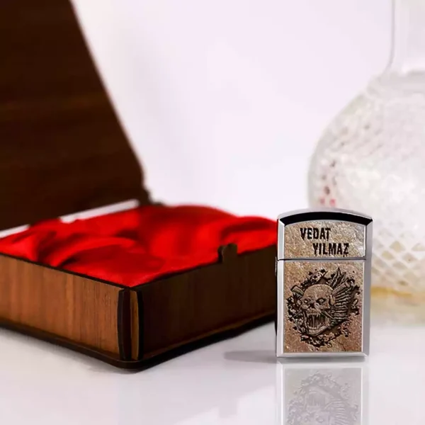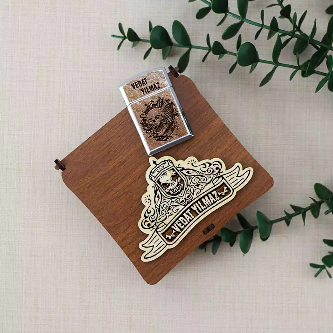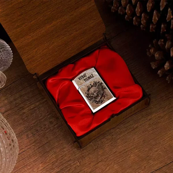 Ahşap Kutulu Kuru Kafa Armalı Grunge Efektli Kişiye Özel Baskılı Çakmak