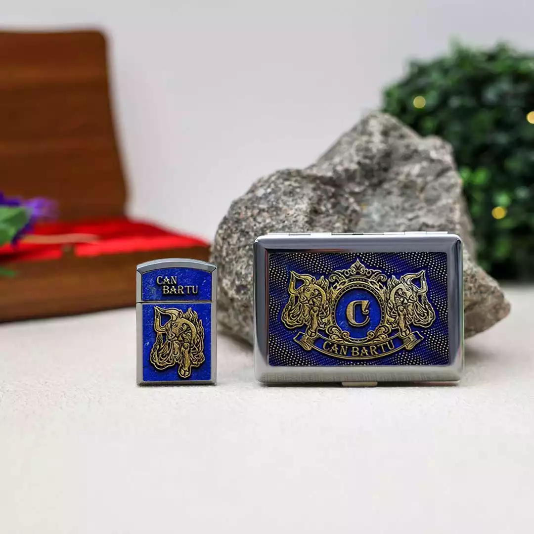 Boğa Armalı Grunge Efektli Kişiye Özel Sigara Tabakası ve Çakmak Seti