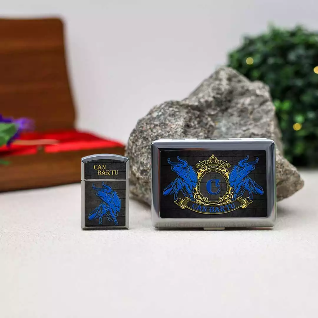 Boğa Armalı Kişiye Özel Sigara Tabakası ve Çakmak Seti