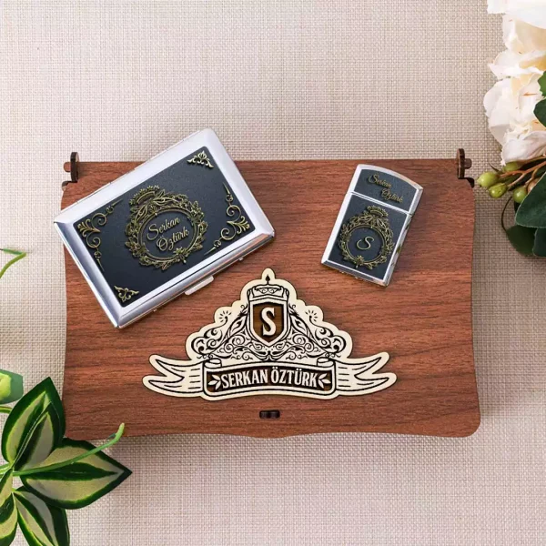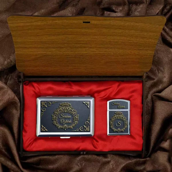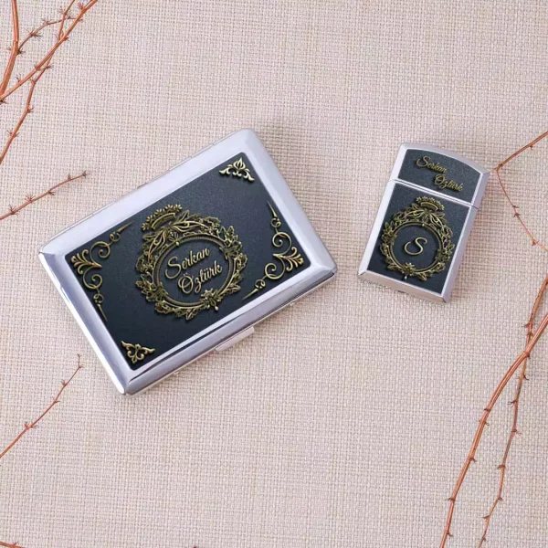 Vintage Tasarımlı Kabartma Efektli Kişiye Özel Sigara Tabakası ve Çakmak Seti